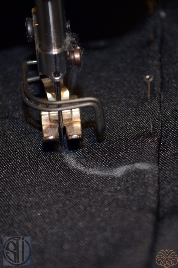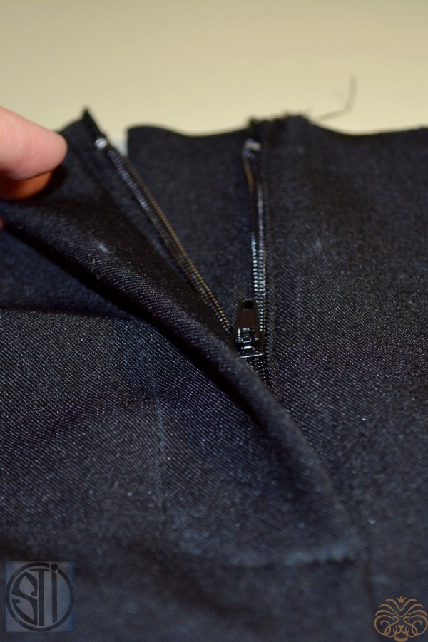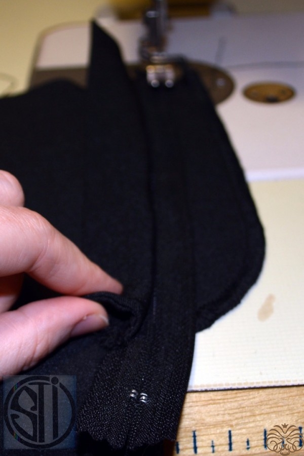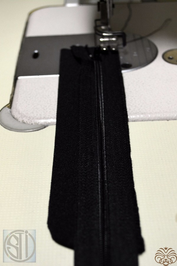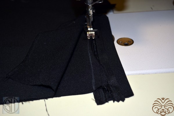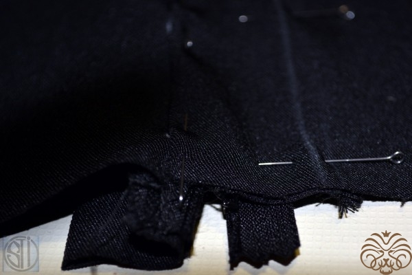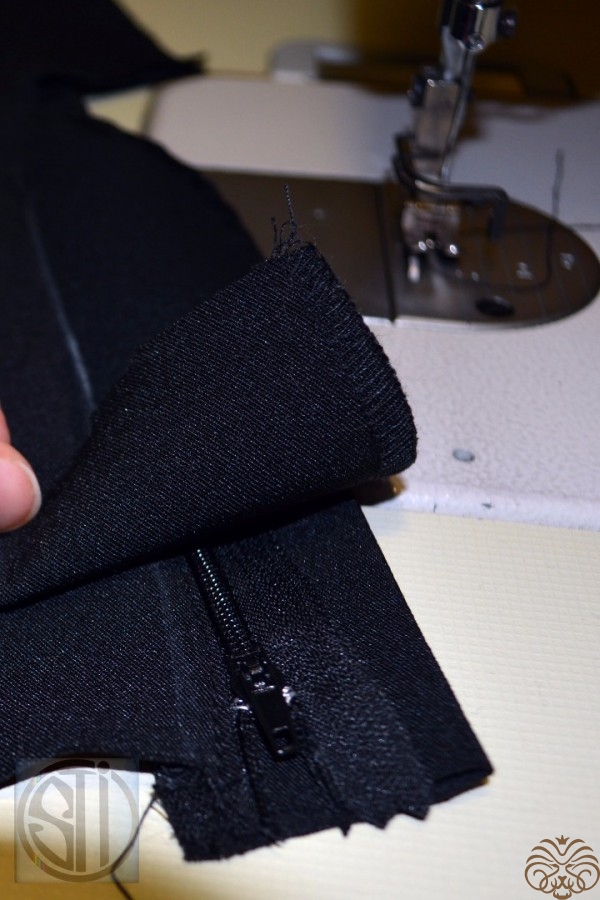 8. Переворачиваем на изнаночную сторону, так чтобы были видны только молния наложенная на гульфик. Настрачиваем молнию на гульфик.