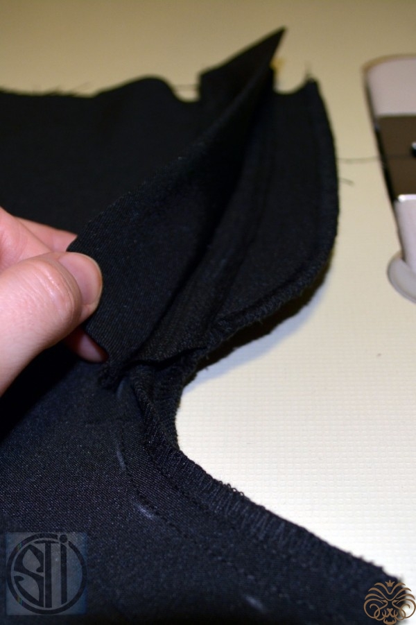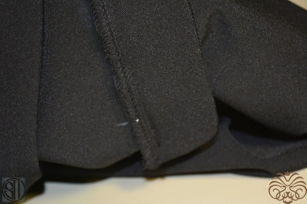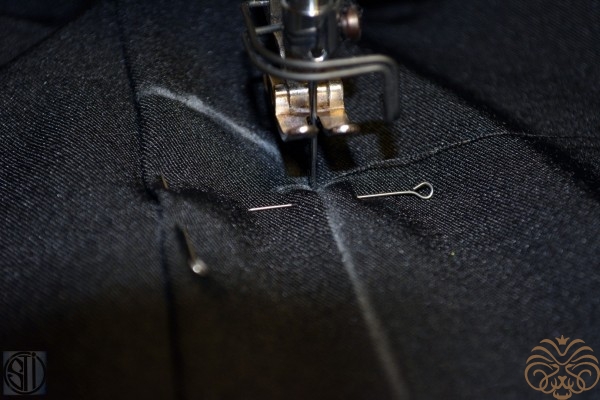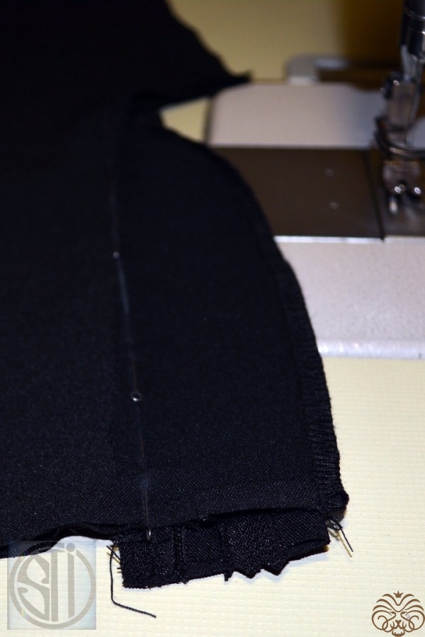 6. Оксокос с настроченной молнией располагаем под левую часть передней половинки. Загибаем половинку припуска (т.е. 1/2 до линии середины передней половинки и настрачиваем его на откосок.