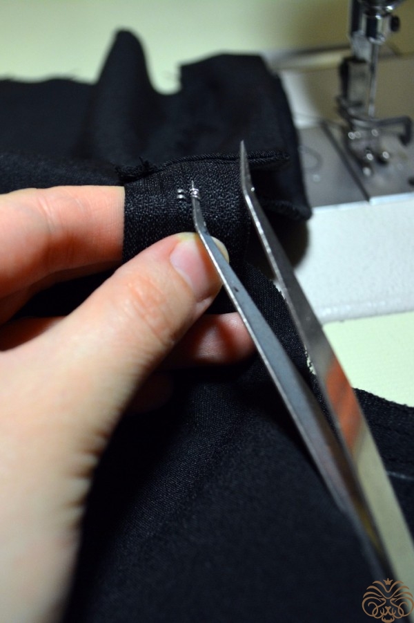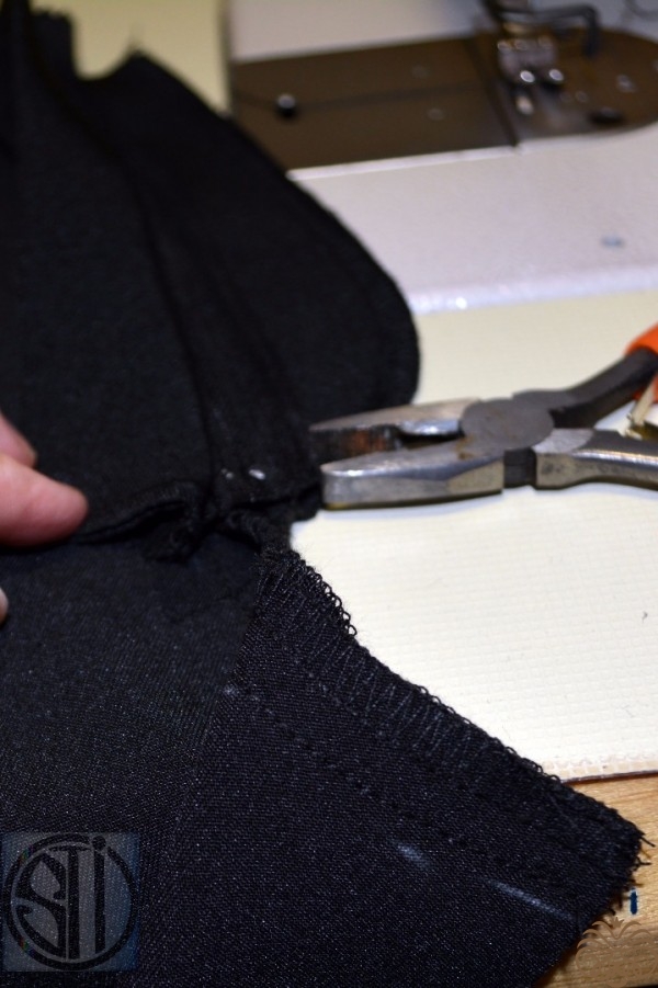 9. Для дальнейшей обработки необходимо переместить металлическую закрепку молнии выше. Для этого разгибаем её,перемещаем на необходимое расстояние и закрепляем с помощью плоскогубцев.