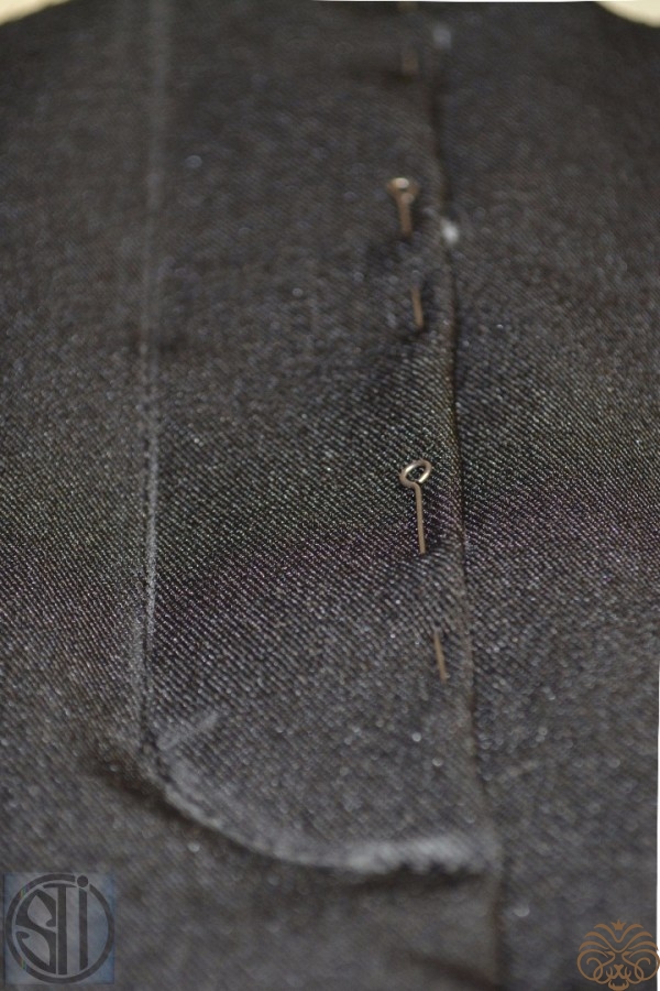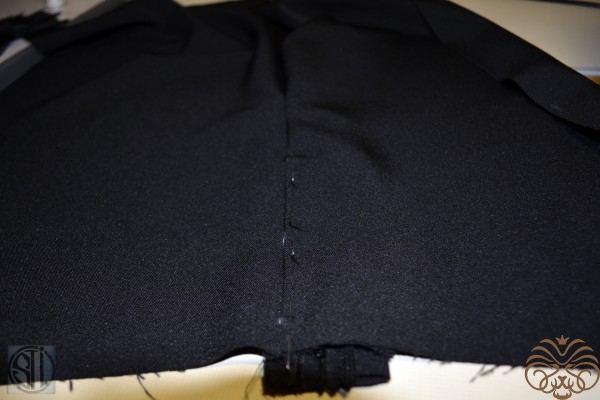 7. Закрываем настроченные детали застежки правой половинкой и скалываем (сметываем) уравнивая середины половинок.