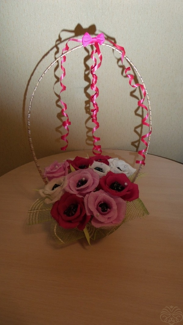 Первый лепесток закручиваем на конфетку и закрепляем армированной нитью. Второй лепесток закрепляем с противоположной стороны. Далее чередуем лепестки, заходя друг на друга каждым последующим. Делаем нужное количество роз из конфет — их удобно ставить в литровую банку в процессе изготовления, чтобы лепестки не помялись, лежа на боку.