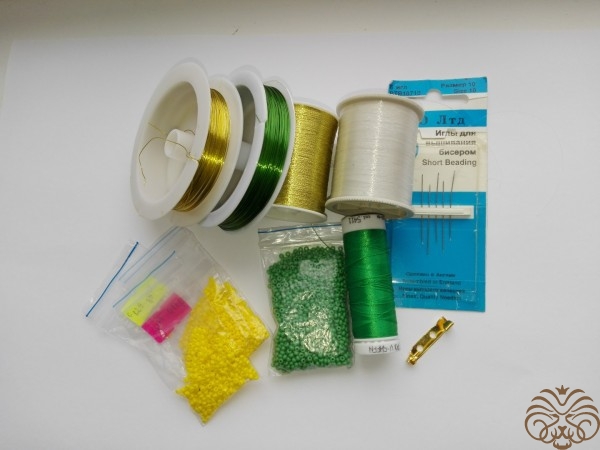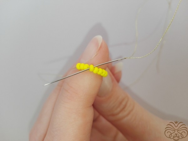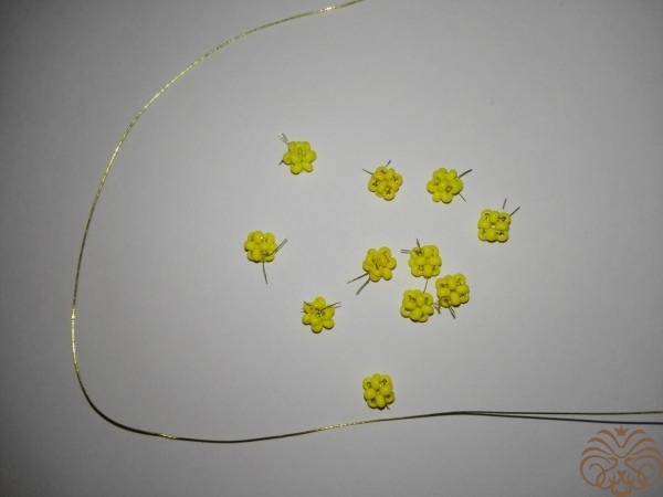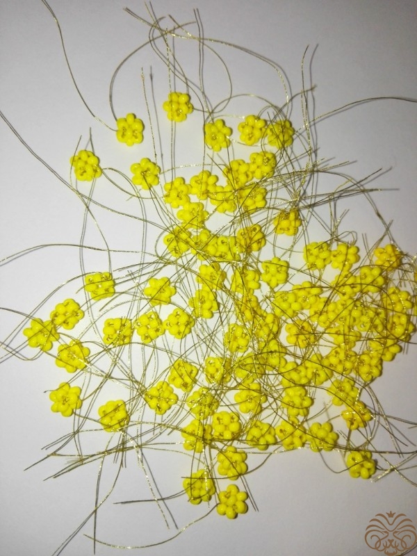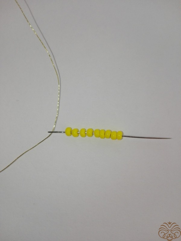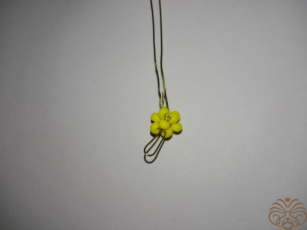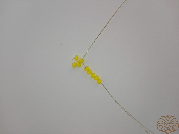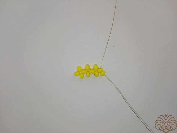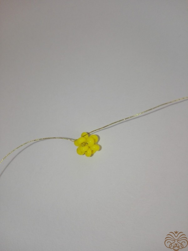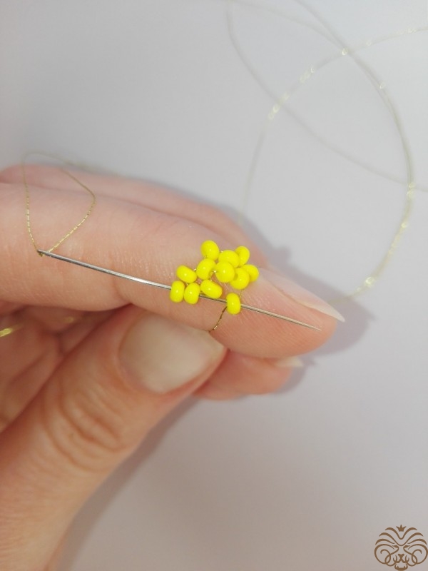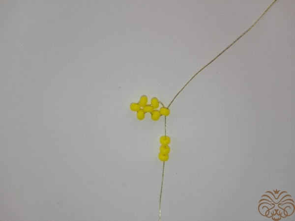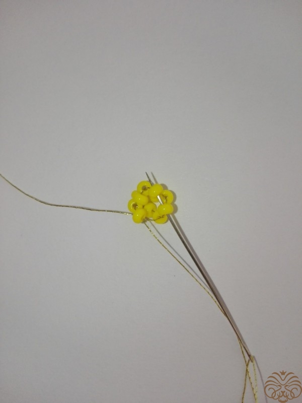 Начинаем плетение с шариков-цветочков. На желтую нить (для таких мелочей использую нить люрекс) набираем 9 бисеринок, проходим через шестую и затягиваем. Получается крестик. Набираем одну бисеринку, проходим через четвертую и затягиваем. Снова набираем одну, проходим через вторую, затягиваем. Получаем 3 крестика. Набираем одну бисеринку, проходим через восьмую бисеринку (начало первого крестика) и через первую, затягиваем. Получаем мягкий шарик. Закрепляем его, пройдя через края крестиков с обеих сторон. Делаем узелок. Лишнюю нить отрезаем (всегда оставляю небольшой кусочек нити и затем прячу его под обмоткой).