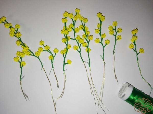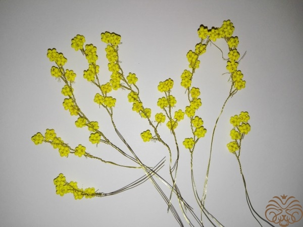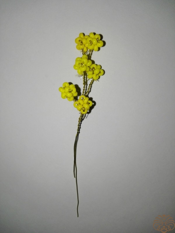 Делаем веточки. Для этого берем кусок желтой проволоки длиной около 30 см (можно и больше), надеваем шарик на проволоку около узелка, проходим через одну из бисеринок, и выходим проволокой из шарика снова около узелка. Закручиваем. На один из свободных концов проволоки снова одеваем шарик и т.д. по очереди, пока не останется слишком маленькие концы проволоки.