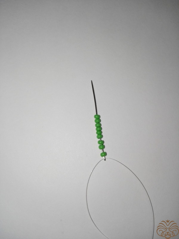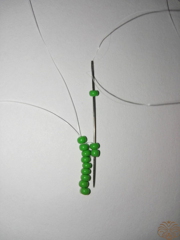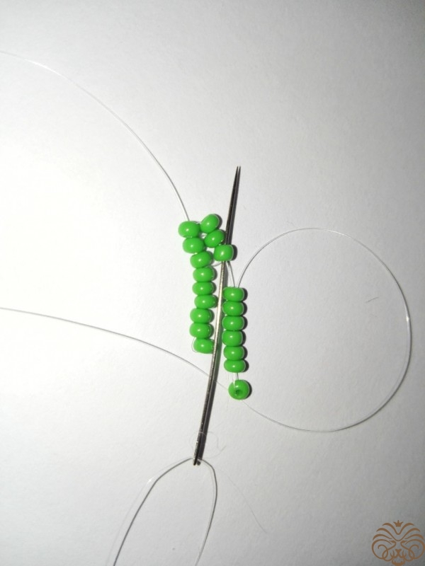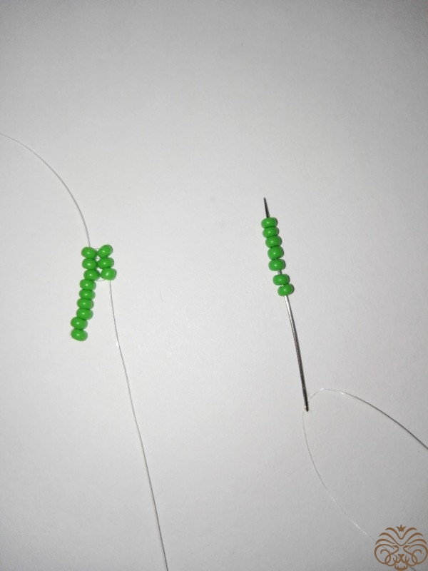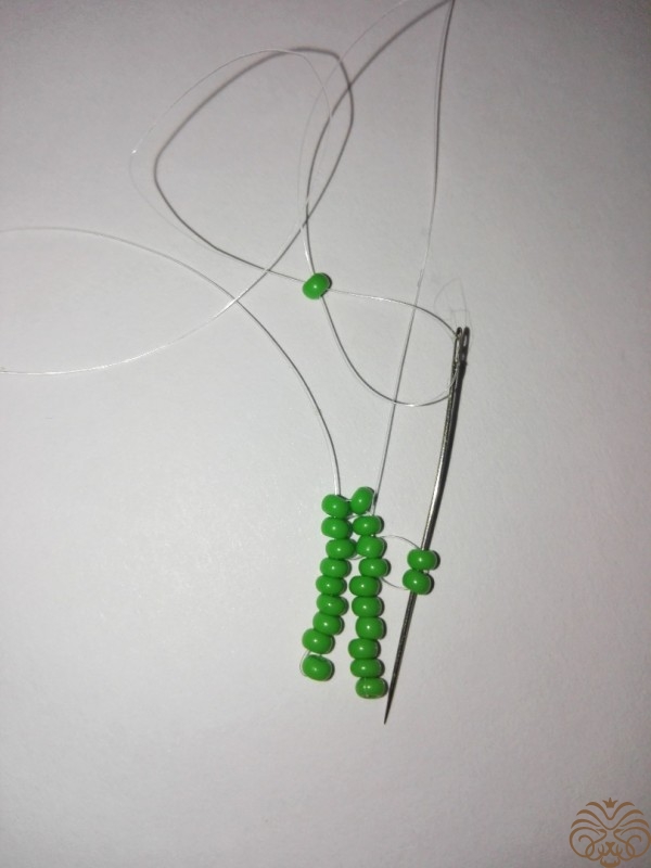 Листья плетем петербургской цепочкой. Набираем 9 бисеринок, последнюю и первую бисеринки попускаем, проходим в обратном направлении через остальные бисеринки. Набираем 2 бисеринки для новой иголочки и пришиваем их к первой, пройдя через третью, вторую и первую бисеринки. Набираем одну бисеринку, проходим через две уже пришитые, набираем еще 7 бисеринок. Пропуская последнюю набранную, проходим в обратном направлении через шесть набранных и одну пришитую бисеринку. Набираем 2 бисеринки следующей иголочки и пришиваем как предыдущую, пройдя через 3 бисеринки, оставляя одну бисеринку в основании иголочки свободной.