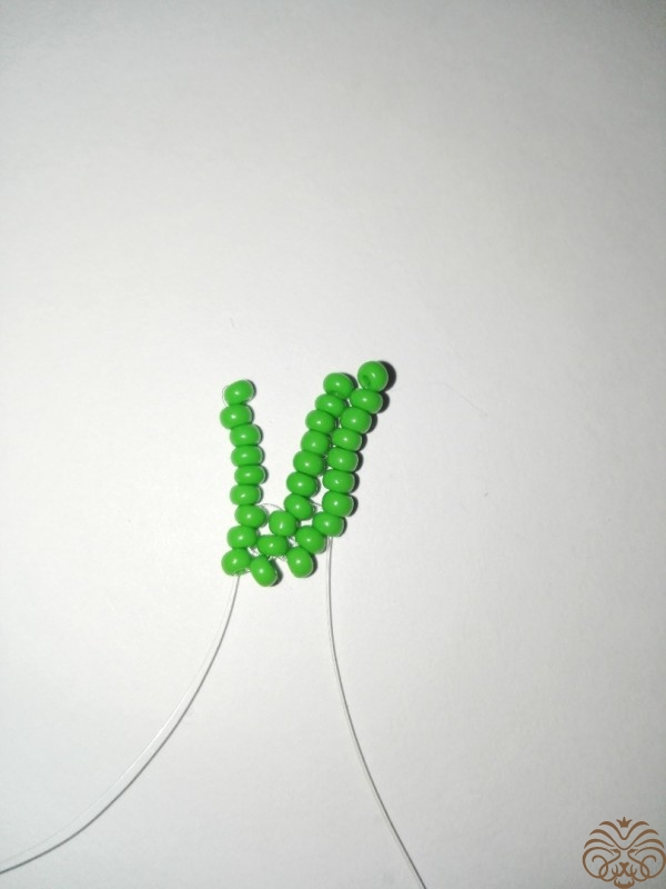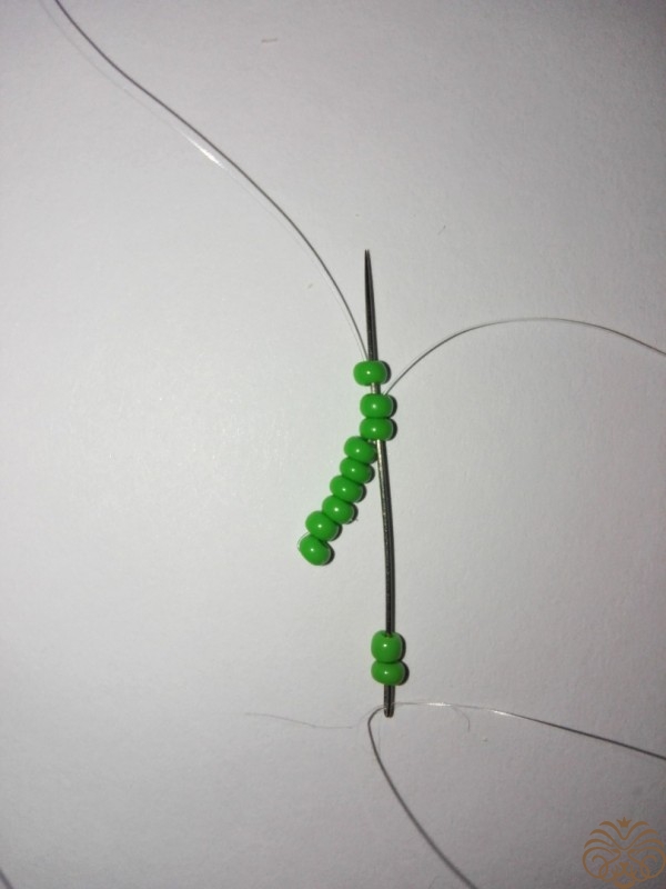 Делаем 15-20 иголочек с одной стороны. К последней иголочке новые бисеринки не пришиваем, а проходим через всю иголочку. Набираем 9 бисерин, пропуская последнюю набранную, проходим через остальные, делая иголочку. Далее проходим через верхнюю выспупающую бисеринку, набираем три бисеринки и пришиваем их к иголочке, пройдя через две бисеринки предыдущей иголочки, а затем еще раз через вторую и третью только что набранные. Далее набираем шесть бисеринок и, пропуская последнюю, проходим через 5 набранных и три пришитых бисеринки. Опять проходим через слеующую выступающую бисеринку, пришиваем три бисеринки, набираем еще шесть и делаем иголочку. Делаем листик до конца. Если несколько иголочек не будет хватать из-за окончания мононити, то ничего страшного в этом нет - можно оставить листочек таким. Завязываем узелок. Отрезаем лишние концы мононити, оставляя несколько сантиметров.
