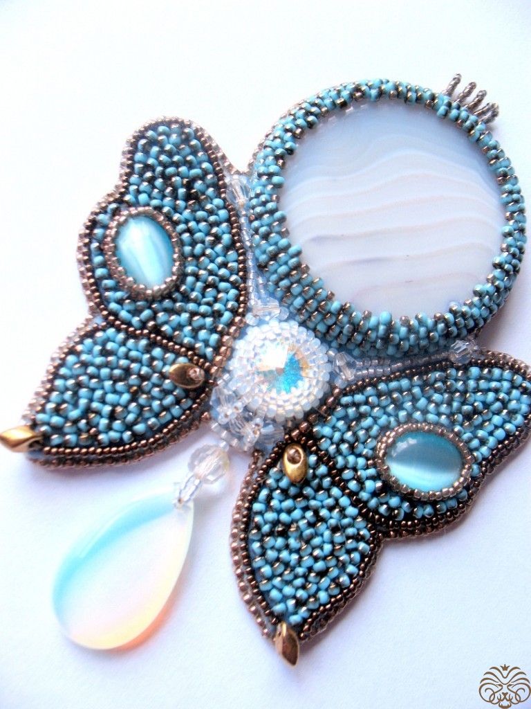 Материалы: бисер Cotobe, бисер Toho, кабошон агата, риволи Swarovski, кабошоны кошачьего глаза (имитация), капелька лунного камня, бусины, натуральная кожа бежевого цвета.