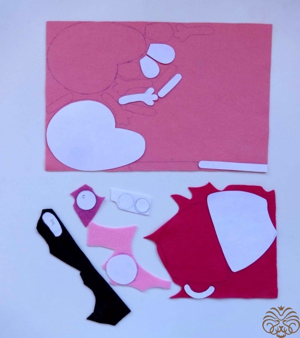 2. фетр(я использую мягкий испанский полушерстяной): четыре оттенка розового, малиновый, белый, черный