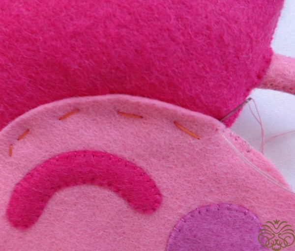 Далее берем уже нитку под цвет фетра и начинаем пришивать: глазки белым цветом, зрачки - черным, улыбку, щечки, носик и ноздри - розовыми ниточками.