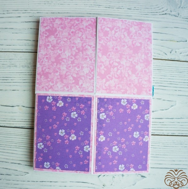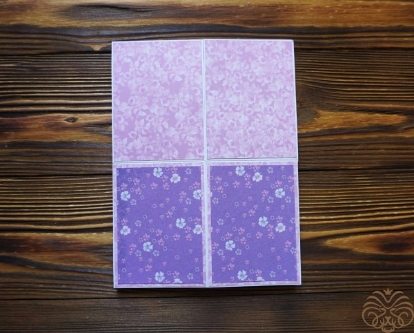 Обклеиваем внешнюю часть открытки скрапбумагой. Я вырезаю прямоугольники из скрапбумаги примерно на 2 мм меньше с каждой стороны размеров окошечка заготовки.