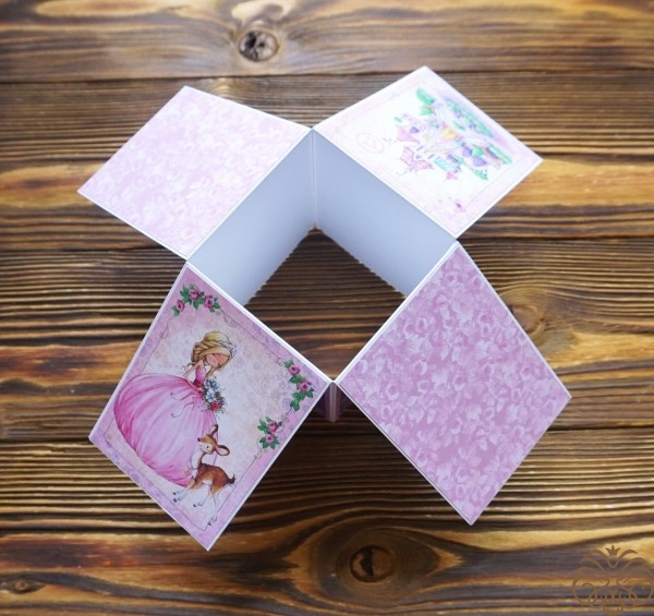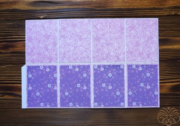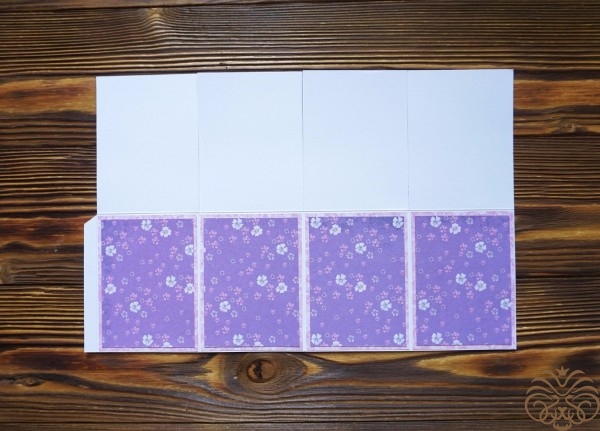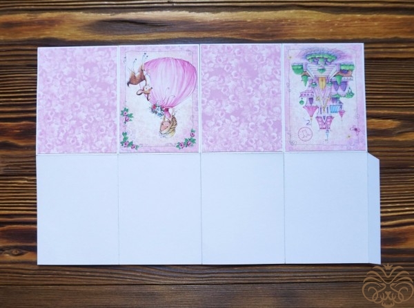 Внутреннюю часть будем декорировать только сверху, т.е. те стороны, которые у нас будут отгибаться. Соответственно карточки приклеиваем "вверх ногами".
