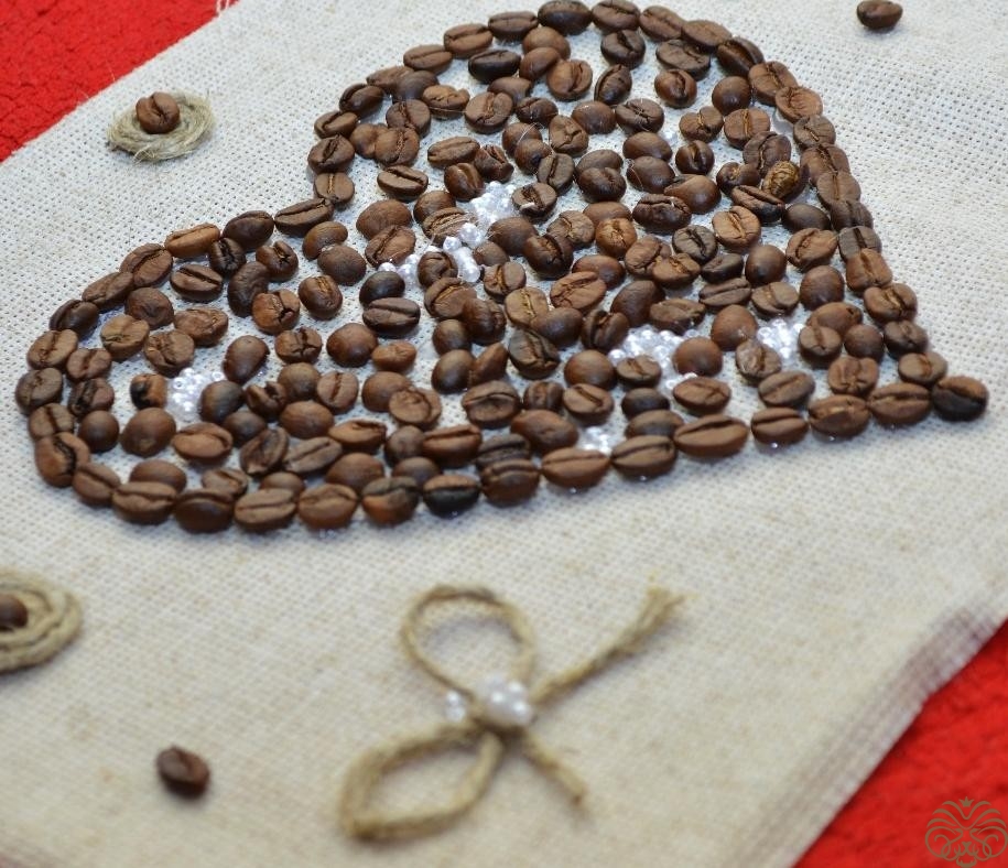 Чтобы на полотне сердце не смотрелось одиноким, его можно до декорировать. Я взяла шпагат и сделала вот такие кружочки (путем закручивания нитки по кругу) и бантики, остальную часть дополнила зернышками кофе.