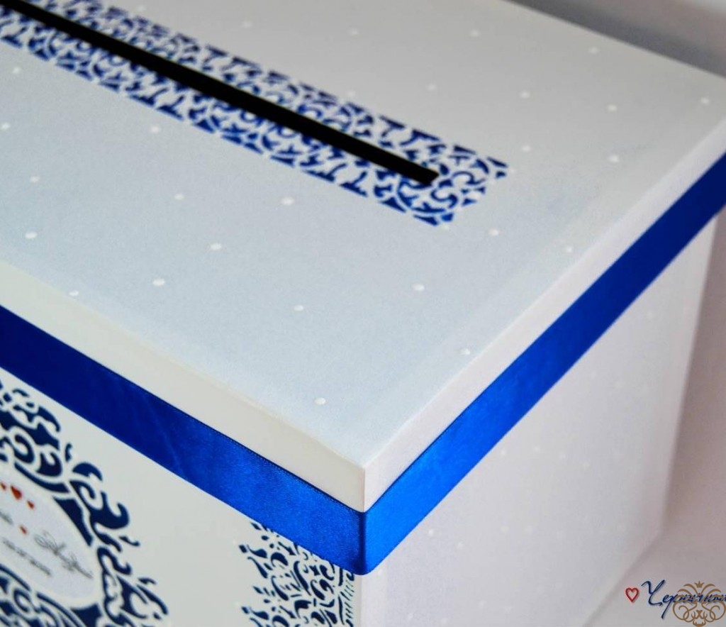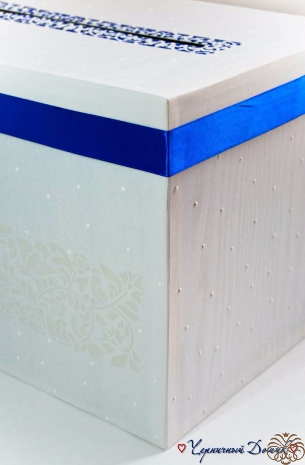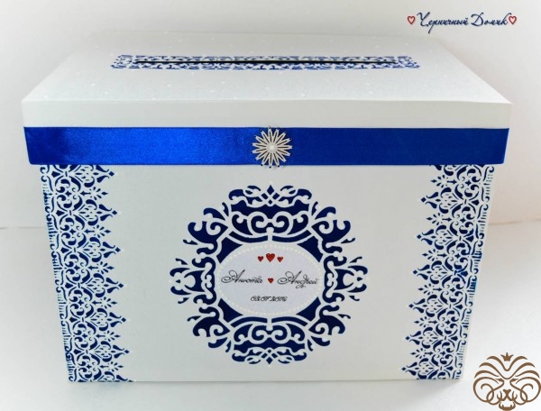 Казна выполнена из плотного картона, декорирована атласными лентами, акриловыми красками, контурами, а так же объемными узорами.