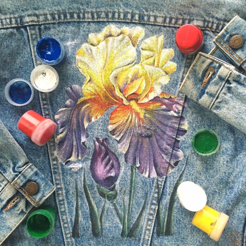Дальше нужна не дюжая храбрость, так что, кто не готов засучив рукава броситься грудью на холст, то не художник)) – переносим ирис на куртку. Первое что нужно сделать, это в голове (а может и на распечатанном рисунке – это поможет вам держать картинку ближе к глазам, с монитора рисовать обычно не очень удобно) разделить рисунок на части. Определите самые крупные элементы и их расположение относительно друг друга. Помните о пропорциях!