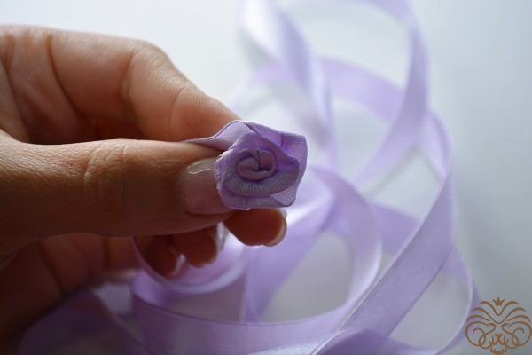 Теперь приступаем к самому кропотливому и, наверное, немного сложному, процессу-делаем мелкие розочки из атласных лент.