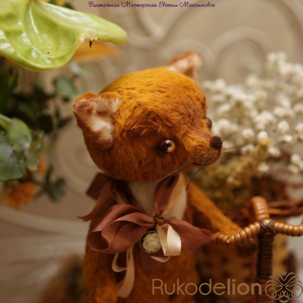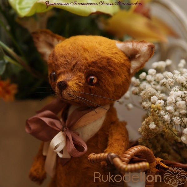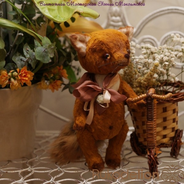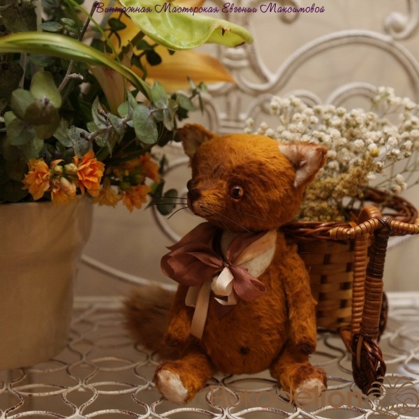Малыш сшить из немецкой вискозы,шплинтовое крепление, глазки стеклянные- ручная работа, носик и воротничок сделан в технике сухого валяния. Набит холофайбером, тонирован масляными красками. Хвостик из натурального меха лисы.