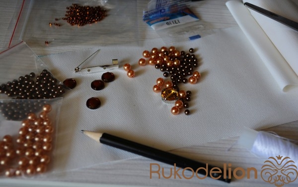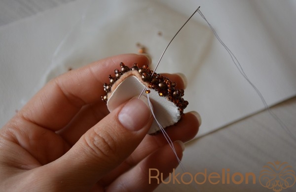Основная работа сделана. Теперь набираем на иголку 10-14 бисеринок и пришиваем их стежками, как показано на фото. Я сделала 4 полосочки-стежка.