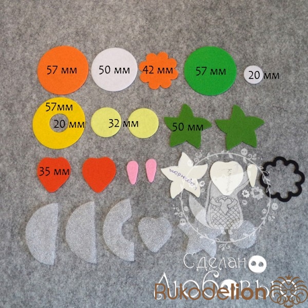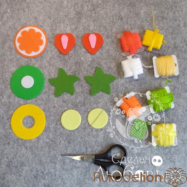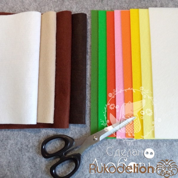 Фетр жесткий: белый, бледно желтый, желтый, оранжевый, бледно розовый, красный, 2 оттенка зеленого. Я использую корейский жесткий фетр.