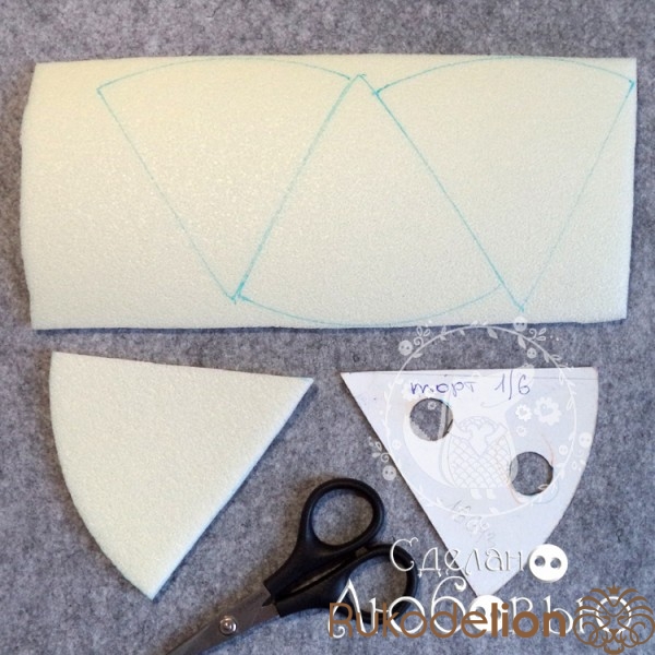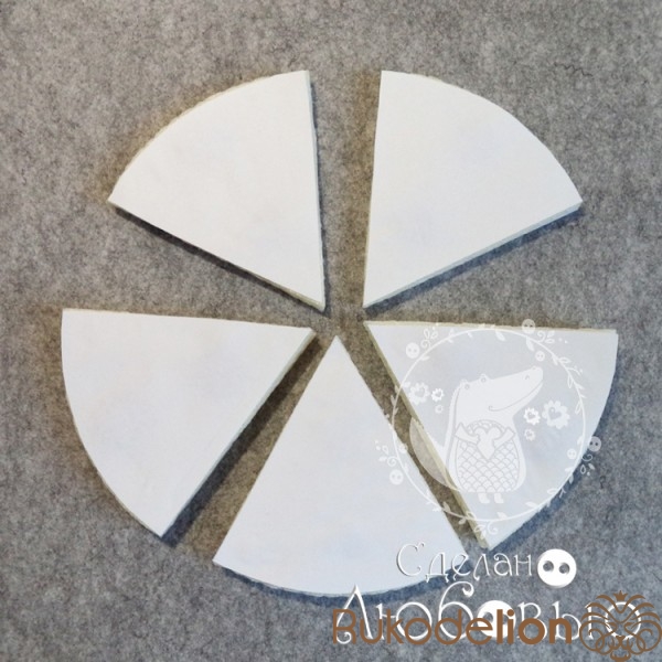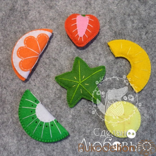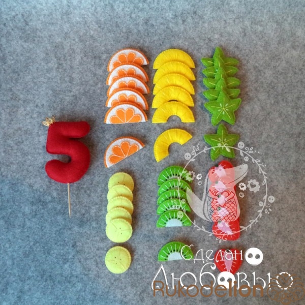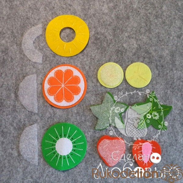 Из жесткого фетра вырезаем детали, как показано на фото. Также вырезаем детали из подложки под ламинат. Она послужит нам "наполнителем" для фруктов. Если мы фрукты будем набивать синтепухом, они станут слишком объемными, а нам нужно добиться эффекта "нарезанных фруктов".