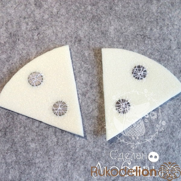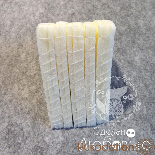 Закрепляем их нитью в произвольном порядке, захватывая поролон, как показано на фото. Стараемся, чтобы с обеих сторон было закреплено равномерно.
