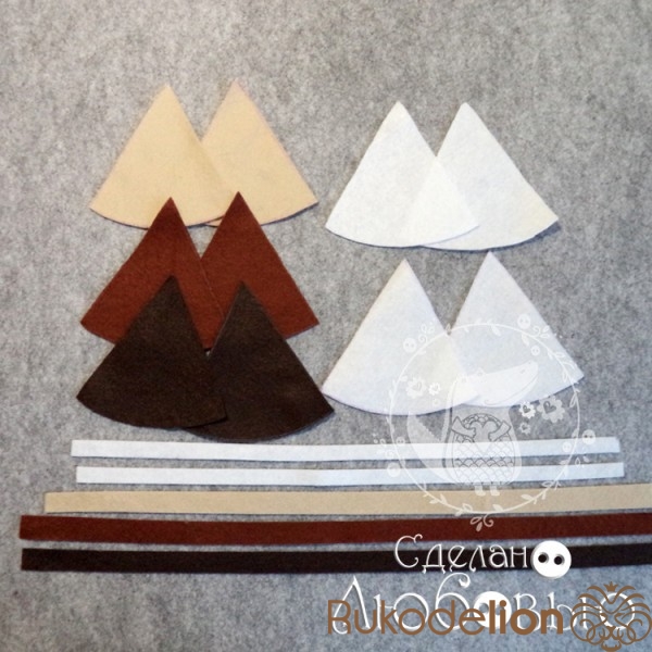 Фетр мягкий: белый (или кремовый), бежевый, коричневый, темно коричневый (шоколадный). Я использую испанский полушерстяной фетр.