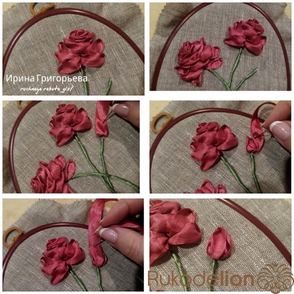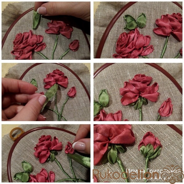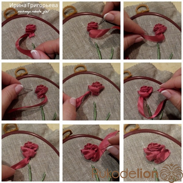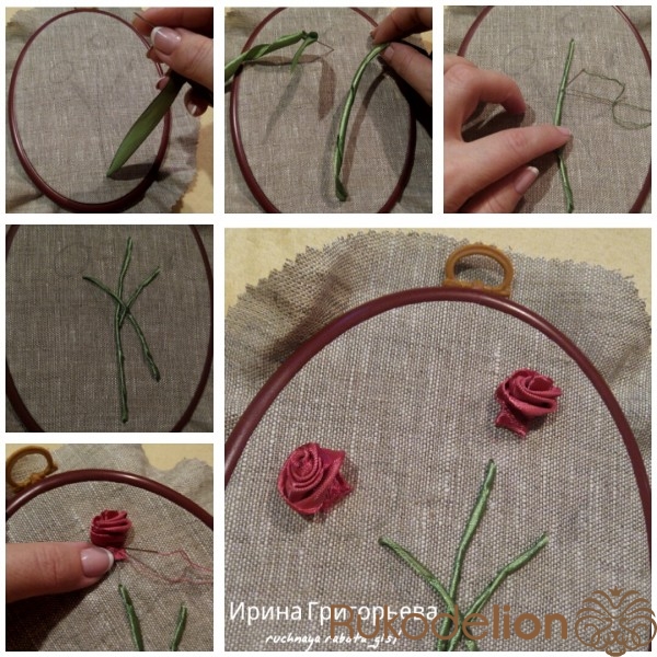 Вышиваем стебли. Возьмите зелёную ленту шириной 12мм, вставьте в иглу, сложите противоположный конец ленты в два оборота по 1см. Проколите слои ленты иглой и протяните ленту сквозь прокол. Получится узелок. Выведите ленту у основания стебля и начинайте закручивать её, поворачивая иглу по часовой стрелке. Вставьте иглу у основания бутона и уведите ленту на изнанку. Придайте стеблю желаемый изгиб, прихватив нитками в тон ленты.