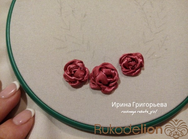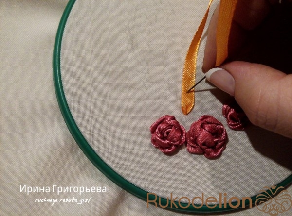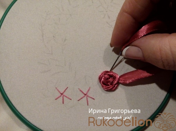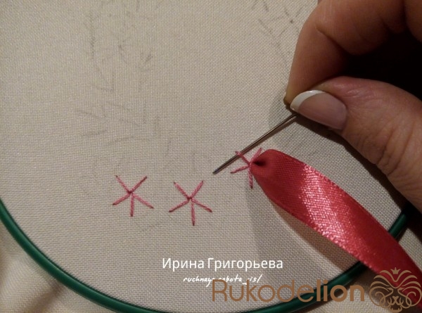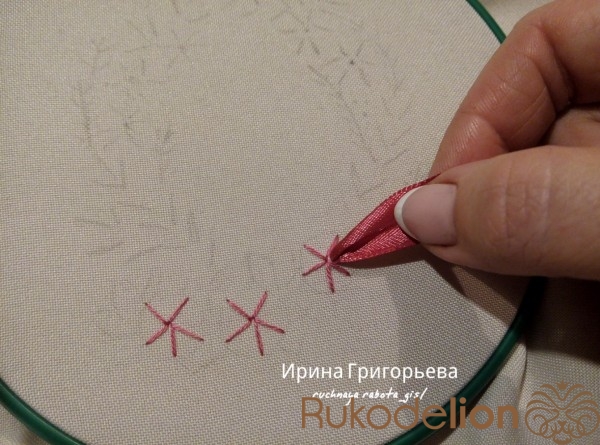 Сделайте нитью 5 прямых лучеобразных стежков - это будет каркас для розы. Выведите рядом с центром ленту розового цвета ш12мм. Выполняйте переплетение против часовой стрелки над и под стежками. Сделайте несколько кругов. Когда образуется цветок и все нити каркаса будут закрыты, выведите иглу с лентой на изнаночную сторону. Так вышейте ещё две розочки.