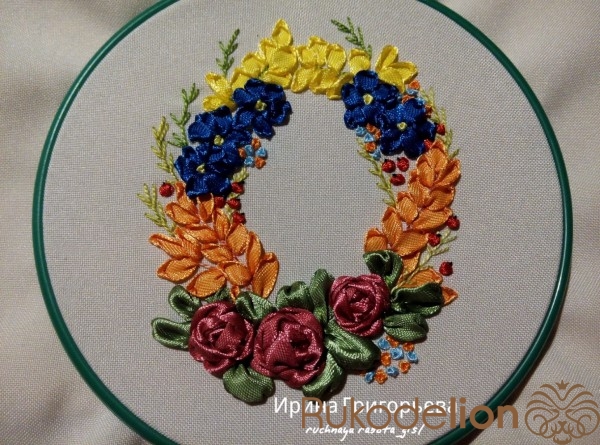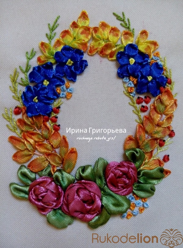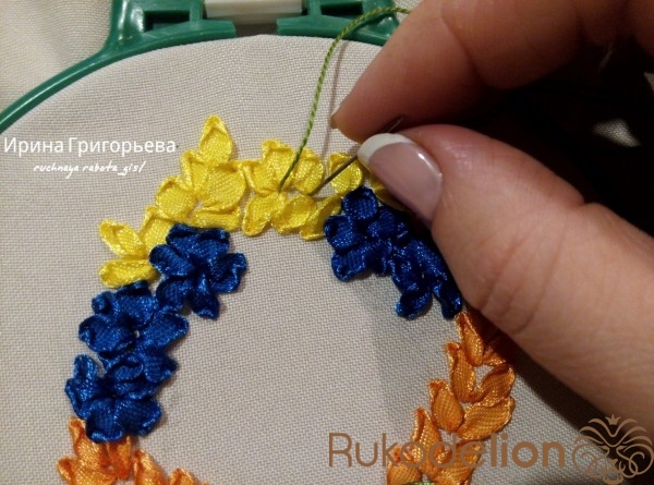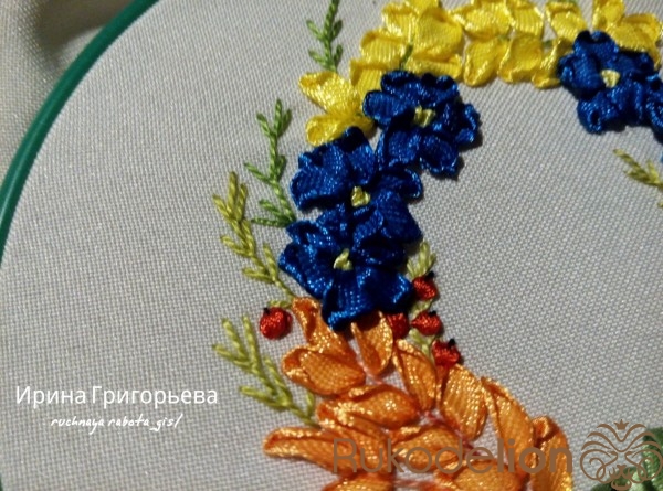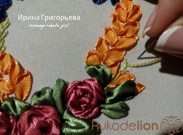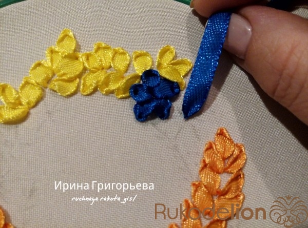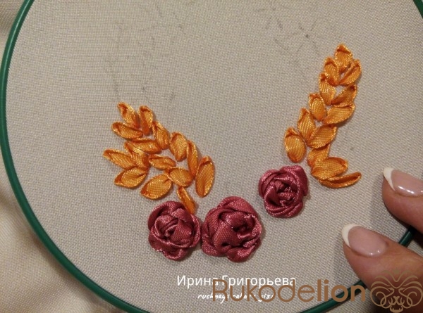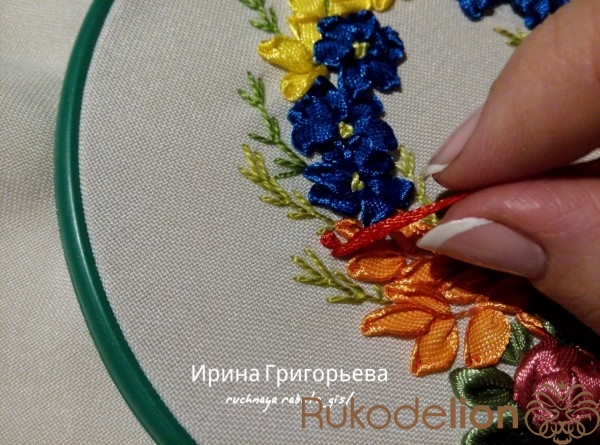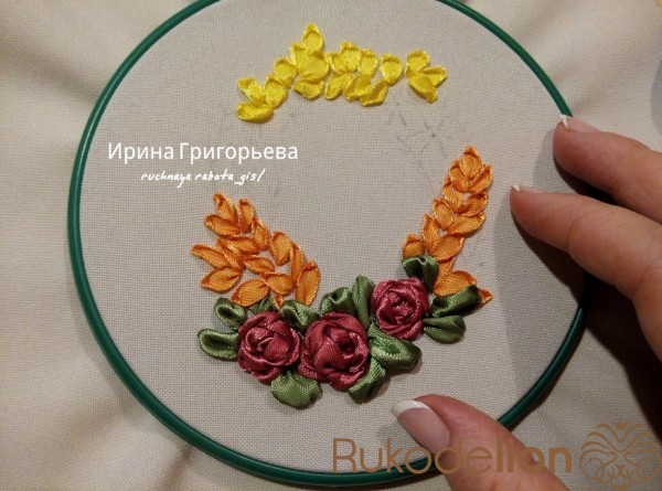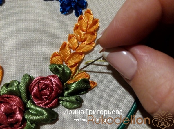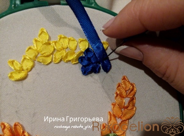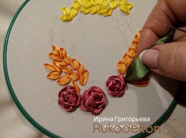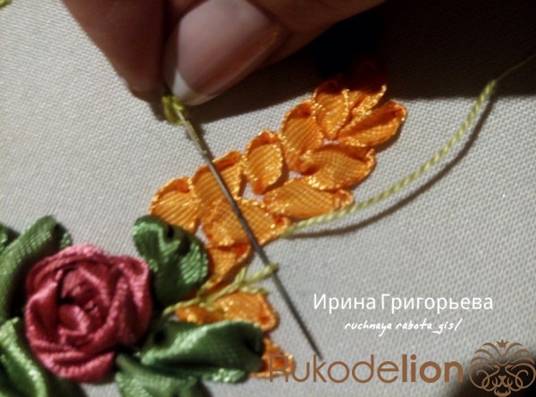Выведите оранжевую ленту ш6мм наружу, уложите её в нужном направлении, проколите ленту иглой и уведите ленту на изнанку. Затягивайте ленту постепенно, пока на её конце не образуется острый уголок (прямой стежок с завитком). Так вышейте все листья оранжевой и жёлтой лентами.