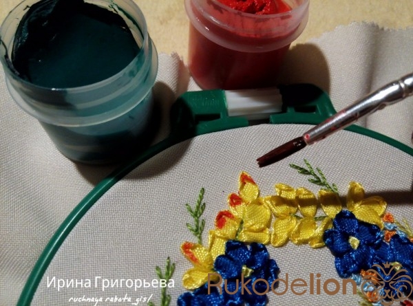 Стебли веточек вышейте швом " вперёд иголку" нитками зелёного и коричневого цветов.
