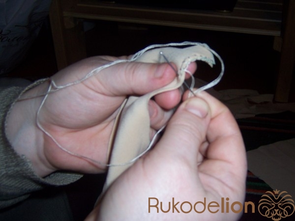 От эластичного бинта-чулка отрезать отрезок длиной ок.30 см и туго перевязать верхний конец. Из наполнителя сформировать тугой шар для головы и натянуть поверх него перевязочный бинт.Бинт ещё раз туго перевязать внизу головы. Голову туго перевязать по одному разу вдоль и поперёк по линии середины для создания рельефа лица(глазные впадины и щёки). От эластичного бинта-чулка отрезать ок.40 см,бинт вывернуть,натянуть на голову,туго перевязать под головой и набить синтепухом(внутренняя часть торса).