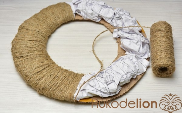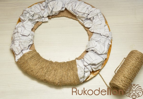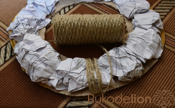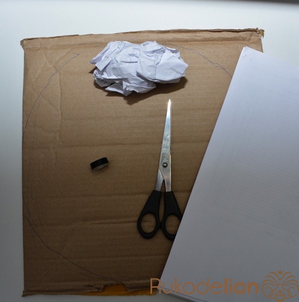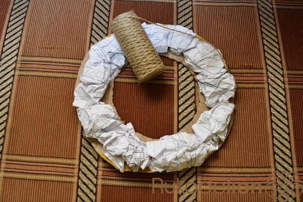 У меня под рукой не было поролона, поэтому я скомкала листы бумаги А4 и поместила их на круг, всю эту конструкцию закрепила ниткой.