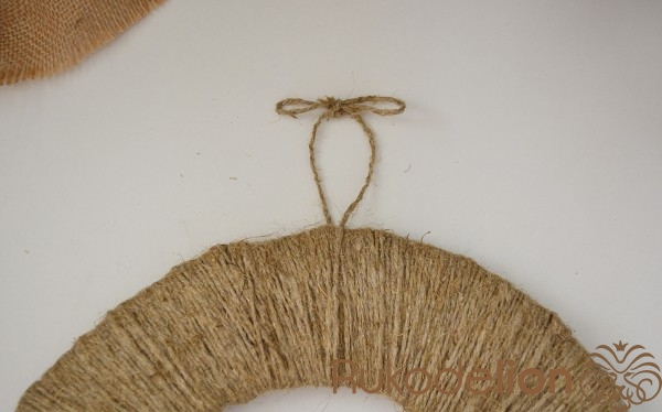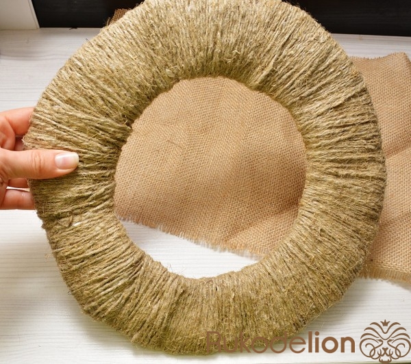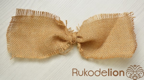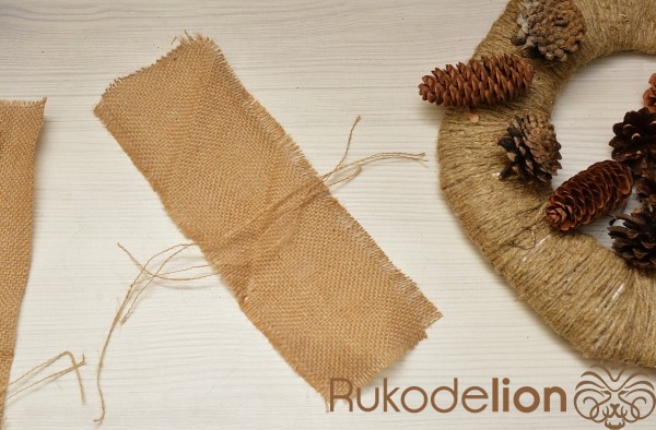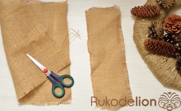 Вырезаем прямоугольник из мешковины. Края нашего кусочка распускаем, чтобы появилась бахрома. Просто вытаскиваем по три ниточки со всех сторон.