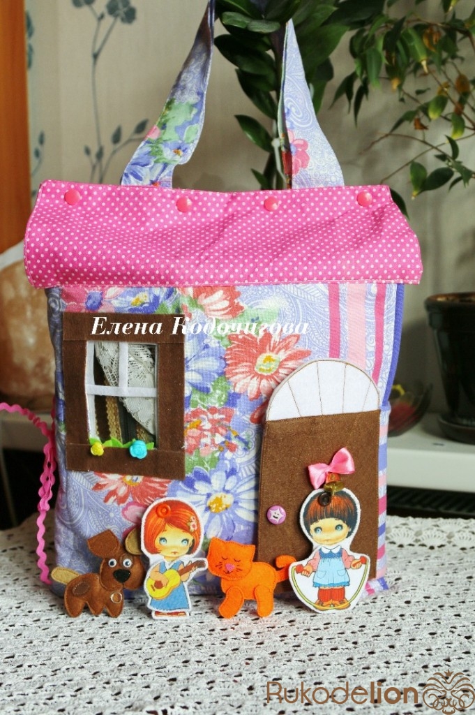 Перед вами очень интересная книга. Это книга-сумка с застёжками со всех сторон. Её удобно переносить, одев на плечо. В ней собраны сюжеты, которые происходят у нас ежедневно: проснуться, одеться, умыться, перекусить, погулять, а кроме того и позаниматься различными занятиями. Девочки постарше уже смогут поучиться готовить на игрушечной кухне компоты, супы, печь торты и пироги. На страничке с ателье - учиться шить платье с помощью задания «шнуровка». На развороте сада - заботиться о растениях, а так же составлять различные букеты. А кто не любит одевать куколок в различные наряды? Кроме игровых моментов в этой книге малышка может развивать мелкую моторику, изучать различные застёжки, а так же изучать цвета и геометрические фигуры. Такая замечательная книга станет верным другом любой девочке на много лет.