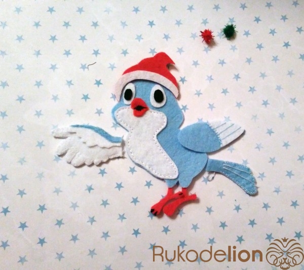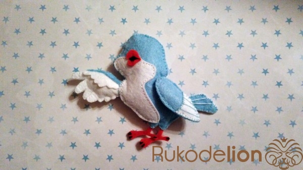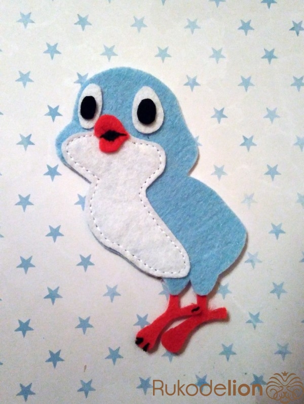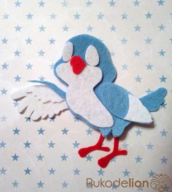 Обводим самоизчезающим маркером выкройки на фетре (на голубом и вырезаем 2 детали туловища, крыло №3 1 деталь, хвост 2 детали, крыло №4 2 детали; на белом фетре - крыло №1 2 детали, крыло № 2 1 деталь, мордочка-грудка 1 деталь, глаза по 1 детали, ободок шапки 1 деталь; на красном фетре - клюв 1 деталь, лапки 4 детали, шапочка 1 деталь )