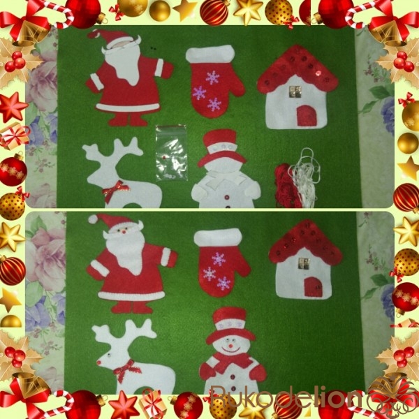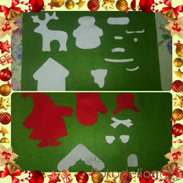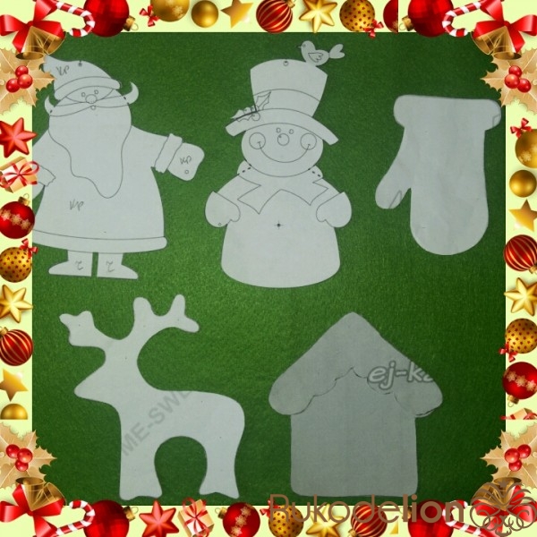 Дед Мороз, Снеговик, Олень, Варежка, Дом ( их основа) 2 части. А украшения ( крыша, шарф, варежки Снеговика, детали Деда Мороза из белого фетра, крыша, дверь, одинарные)