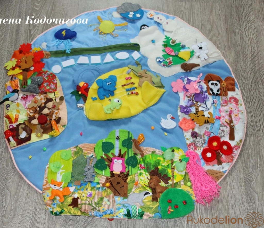 На данный момент это самый большой коврик из сшитых мною)) На коврике поселилось 29 обитателей, среди которых есть животные леса, пустыни, тропиков, Арктики и Антарктиды, а так же жители подводных глубин. На нежном весеннем острове расцвели вязаные и фетровые цветы, а ива так и просит завязать ей косичку.В жаркой Африке в песке спрятались различные предметы, есть счёты, на которых можно считать фрукты, ягоды и листья. Из геометрических фигур малыш может построить мостик от зимнего до осеннего острова, а наряжать ёлочку - это любимое занятие любого ребёнка. Осенний остров пестрит красками. Шуршат деревья, падают жёлуди, ёжик собирает грибы, а малыш поможет ему дойти до своей норки по цифрам-шнуровке. Летний остров тёплый, солнечный и зелёный. На нём всё растёт и грибы, и ягоды, и яблоки. Здесь мы ищем пары каждому жучку и бабочке. На небе можно увидеть радугу, если поставить вместе дождик и солнышко, или устроить ночь с помощью месяца и звёзд, а можно и просто устроить метель. Прищепки, пуговки, молния, карабины, пряжки, всевозможные виды кнопок и крючков, искалка, лабиринт, крестики-нолики - далеко не весь список заданий. С таким ковриком любой малыш сможет надолго увлечься игрой и окунуться в мир сказок и фантазий.