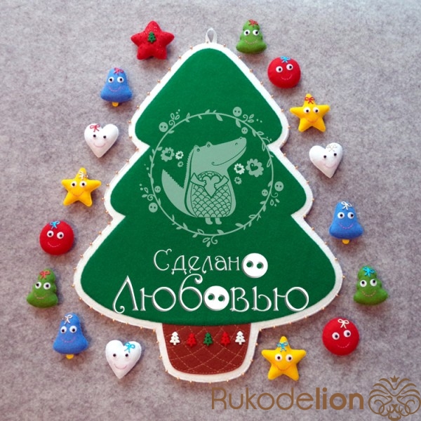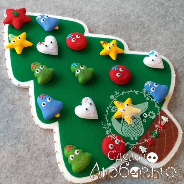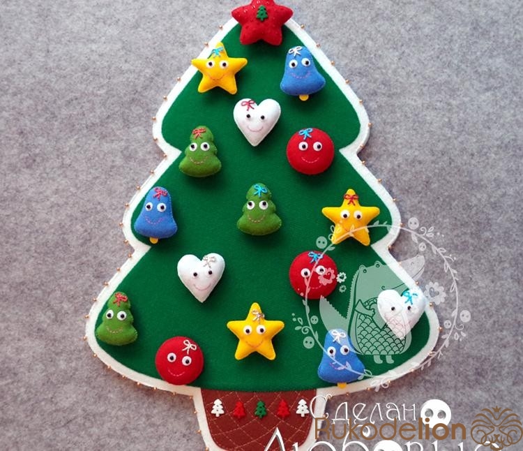 К ёлочке прилагается 15 съемных игрушек с глазками, и 1 звезда на макушку, все игрушки на липучке.