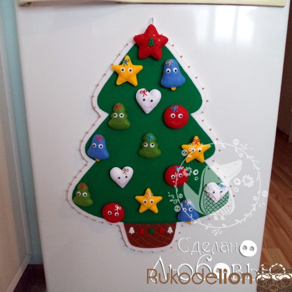 Ёлочка из фетра и велкро ткани, высота - 48 см, ширина - 37 см, толщина -12 мм. В ёлочку надежно вшиты 7 магнитов, по этому она прекрасно держится на ровной металлической поверхности, например на холодильнике. Так же на макушке есть петелька, за которую ёлочку можно повесить на стену.