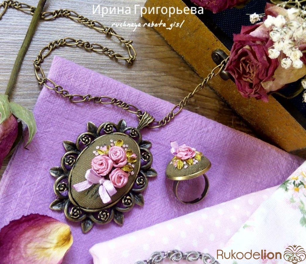Теперь вышьем бантики. Выведите на лицевую сторону ленту 3мм шириной и уведите на изнанку, оставляя небольшую петлю из ленты. Снизу от середины петли выведите ленту, подтяните петлю до нужного размера и уведите ленту на изнанку сверху от середины петли. Выведите ленту с левой стороны банта и обрежьте по косой, край опалите огнём, чтобы в дальнейшем лента не распустилась. Так же вышейте кончик банта с правой стороны. То же проделайте с деталью для кольца.