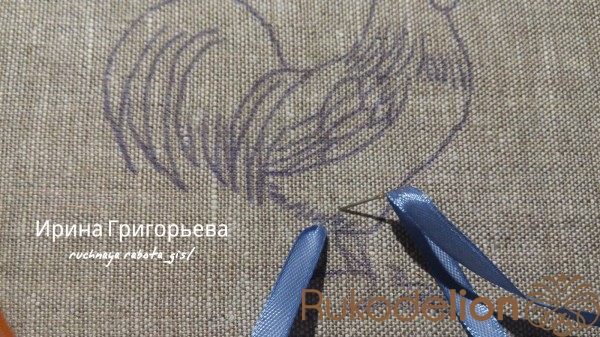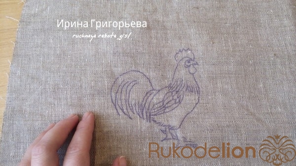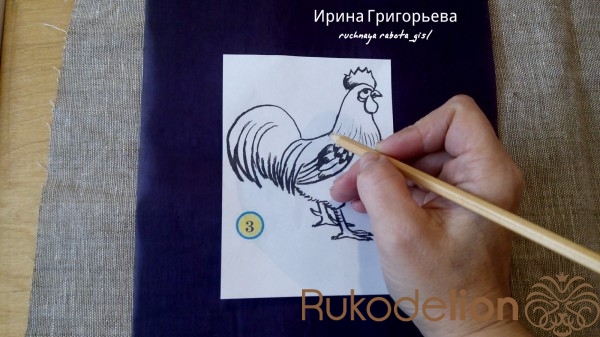 Итак, начнём! Найдите для себя интересный рисунок петушка и, с помощью копирки, перенесите рисунок на ткань. Натяните ткань с рисунком на пяльца.