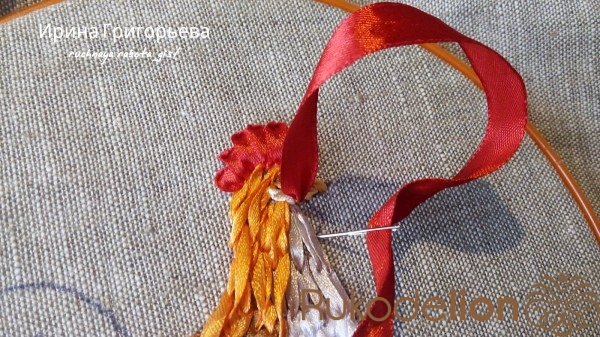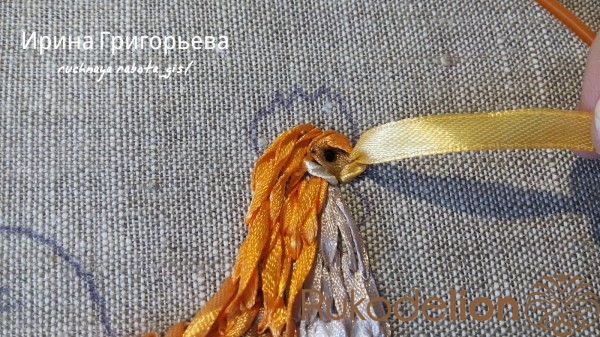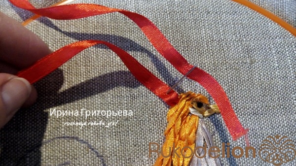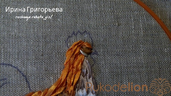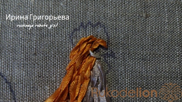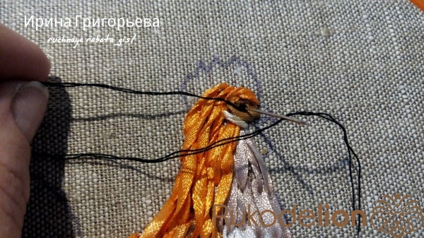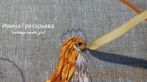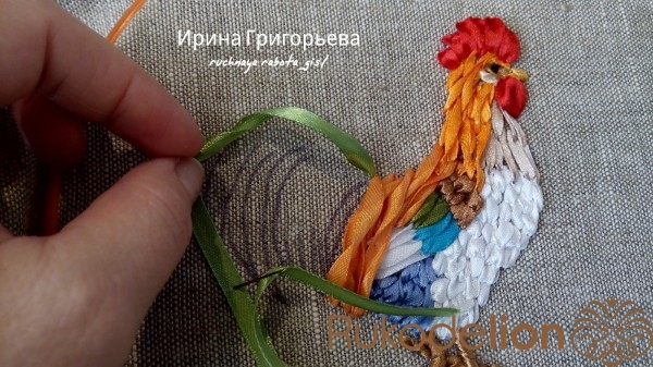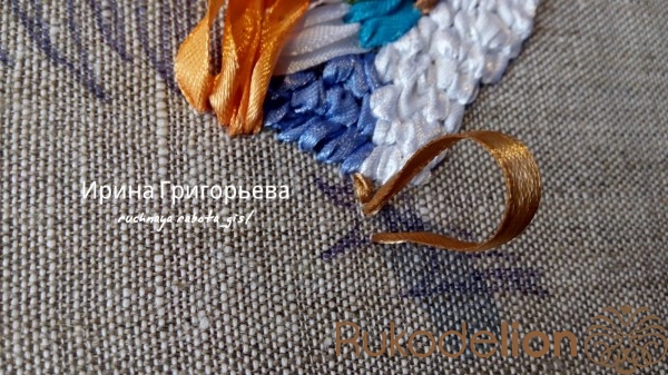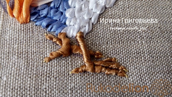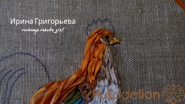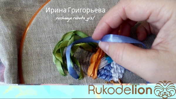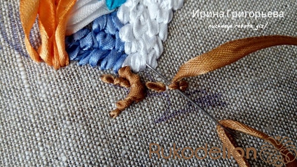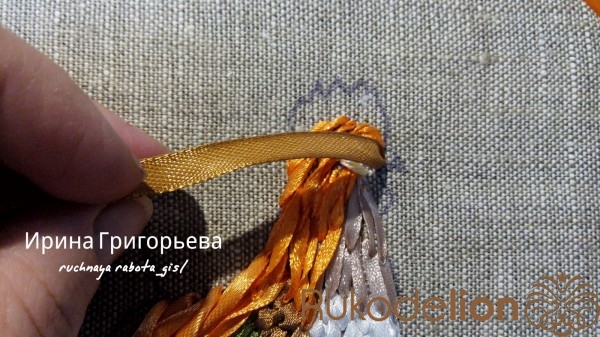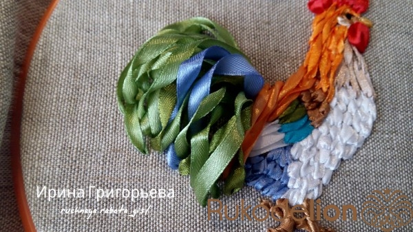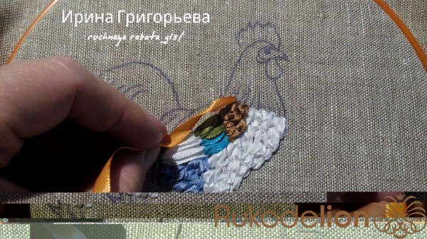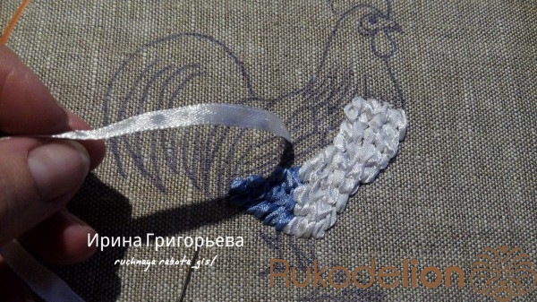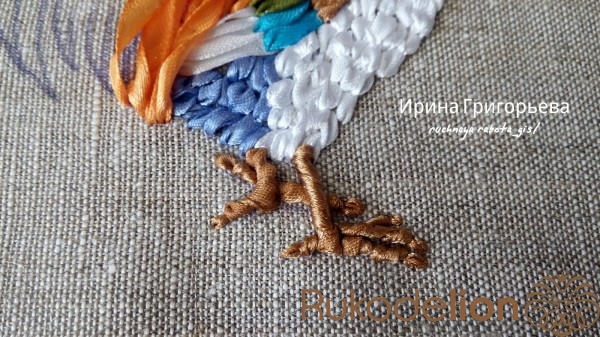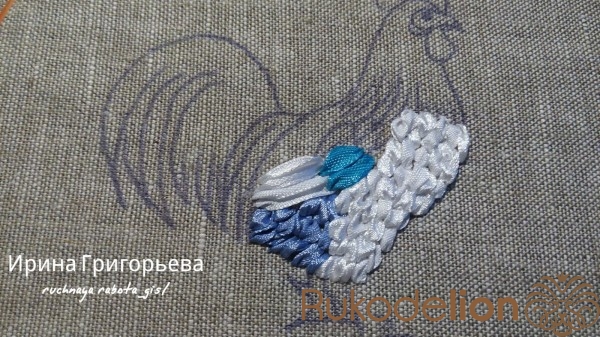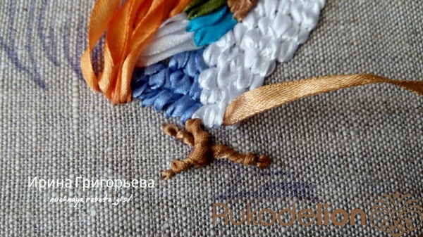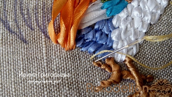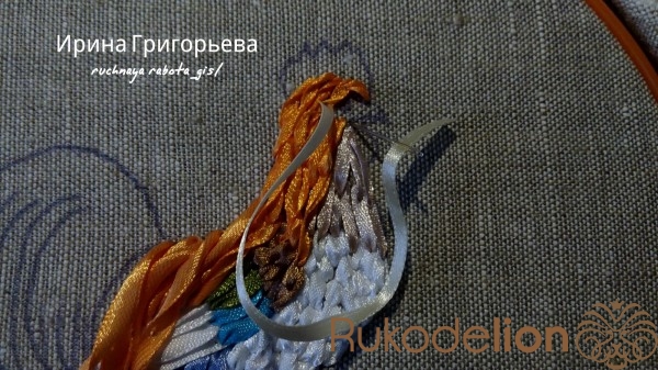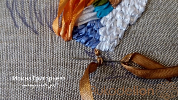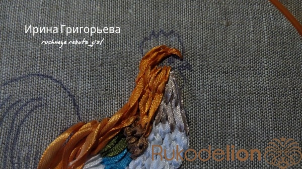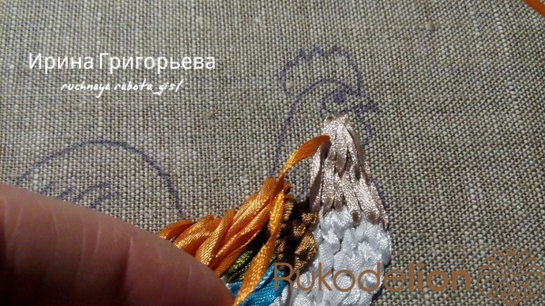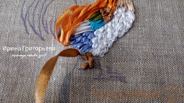 Теперь вышьем крылышко, оно состоит из нескольких цветов лент. Начинаем с нижней части - имитируем оперение. Возьмите белую ленту ш.6мм и сделайте четыре прямых удлинённых стежка, затем проложите по два стежка зелёной и голубой лентой. Не забывайте вводить иглу с лентой в стежки предыдущего ряда, чтобы не образовывались чёткие границы, а был плавный переход из одного ряда в другой. Далее вышейте два ряда коротких прямых стежков лентой ш.6мм коричневого цвета.