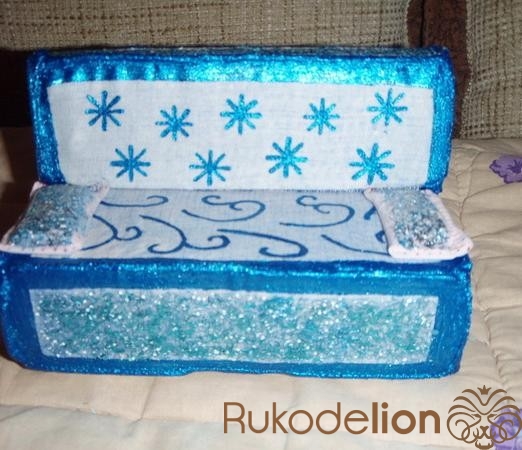 1) Примерно тем же образом декорируем две части дивана: переднюю часть сидения и верхнюю часть спинки. Красим лаком, затем - посыпаем голубыми блёстками и приглаживаем кисточкой. Наносим дополнительный закрепляющий слой лака.