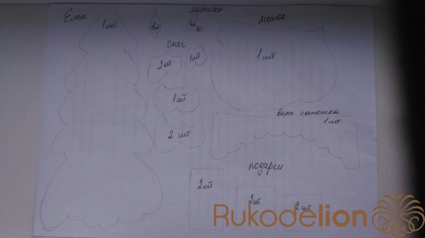 Делаем выкройки снега на елочку. Начиная  с макушки - первая и третья снежная веточка пришиваются сразу к елочке и набиваются синтепоном.  Вторая и четвертая веточки сшиваются из отдельных двух деталей , затем набиваются синтепоном и пришиваются к елочке.