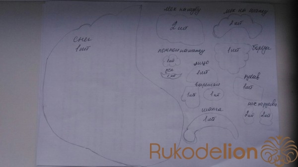 Сшиваем выкройки меха на шапку, шубу, рукава. Набиваем их синтепоном и пришиваем  к основе .