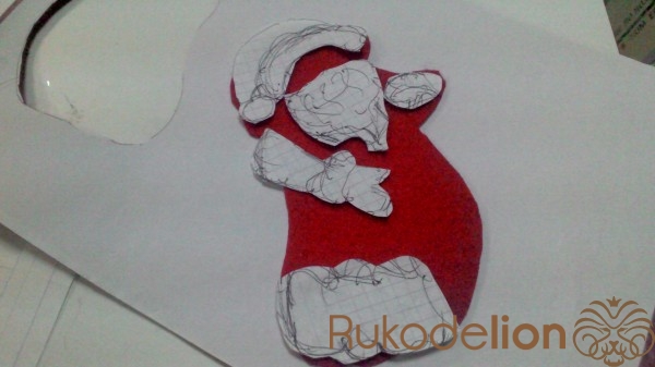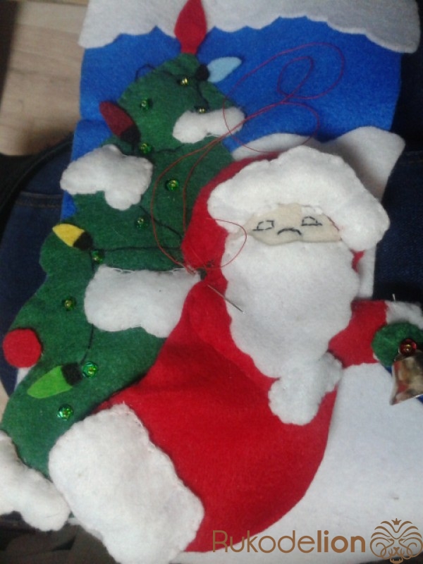 Пришиваем Деда Мороза на 2\3 части к сапожку заходя на елочку ,  набиваем наполнителем и пришиваем уже полностью.