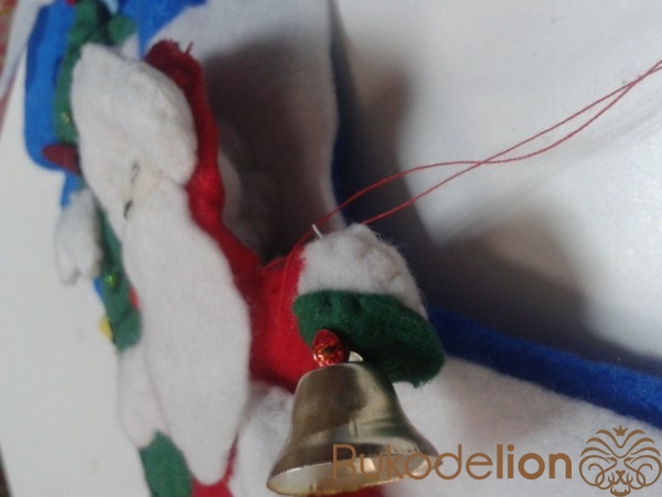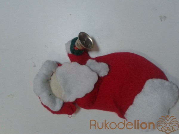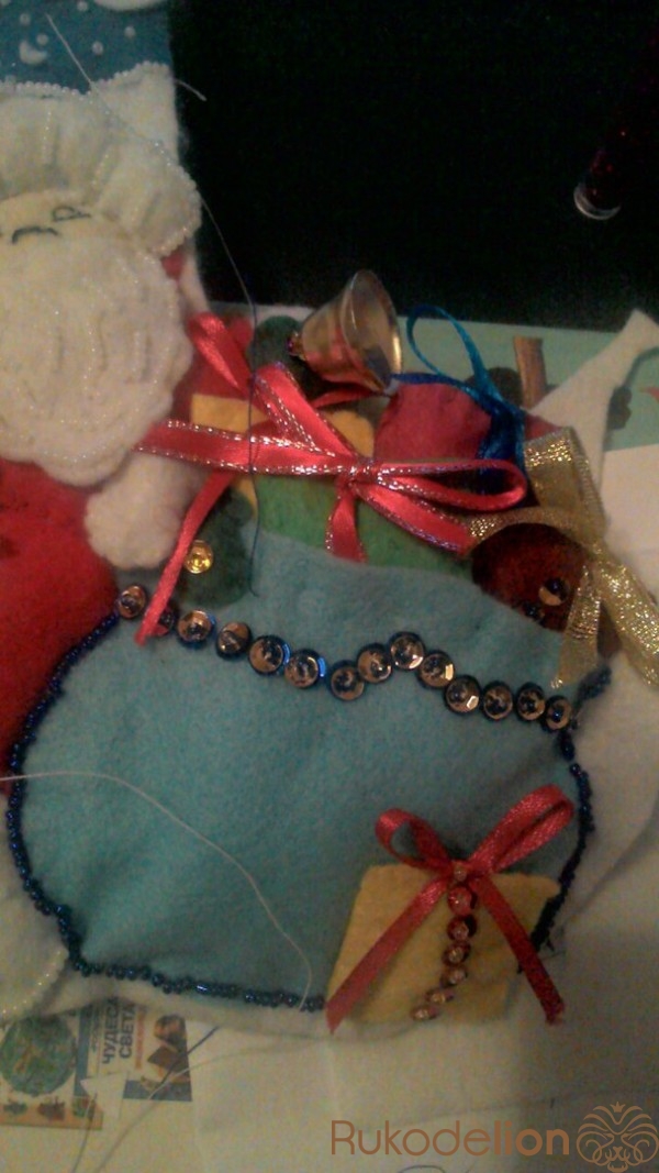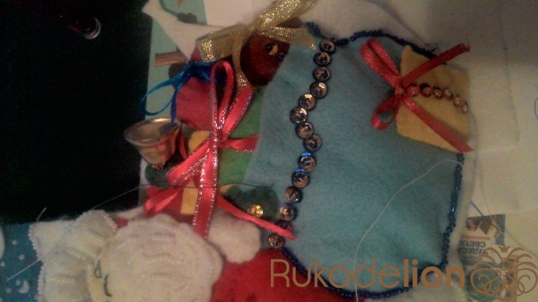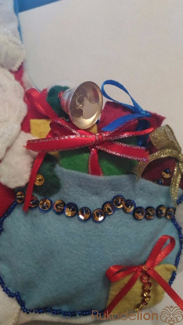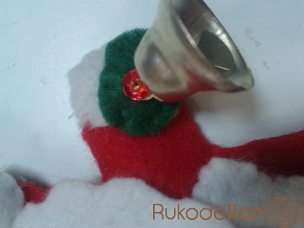 К поднятой руке пришиваем варежку и колокольчик, украшаем бисером и пайетками.