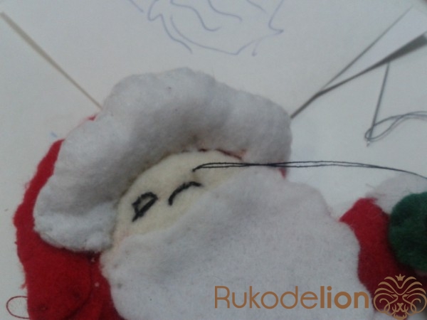 Пришиваем  брови и усы Деду Морозу, вышиваем рот.