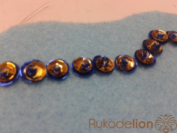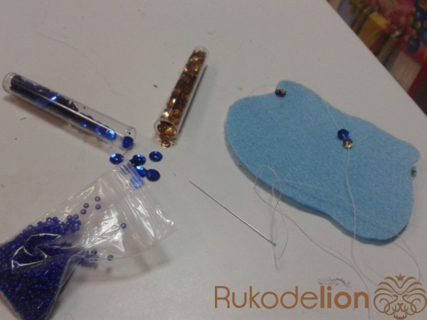Украшаем сапожок синим бисером по контуру.