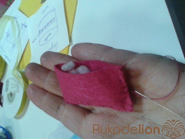Вырезаем по  выкройке   подарки из желтого, розового ,зеленого и бордового фетра. Сшиваем части выкройки и набиваем, украшаем пайетками и бантиками.