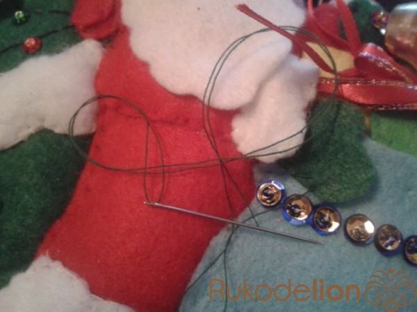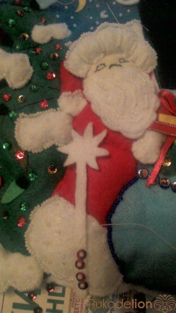 Пришиваем посох Деду Морозу и украшаем его бисером и пайетками.