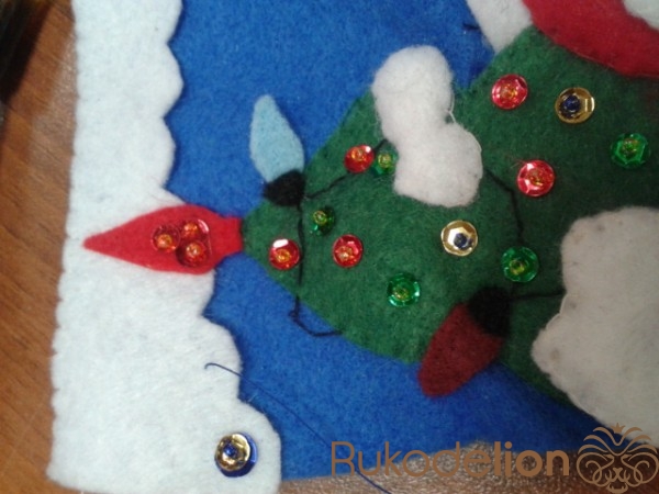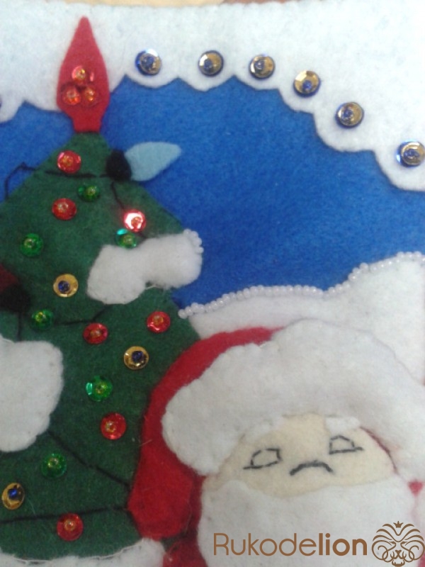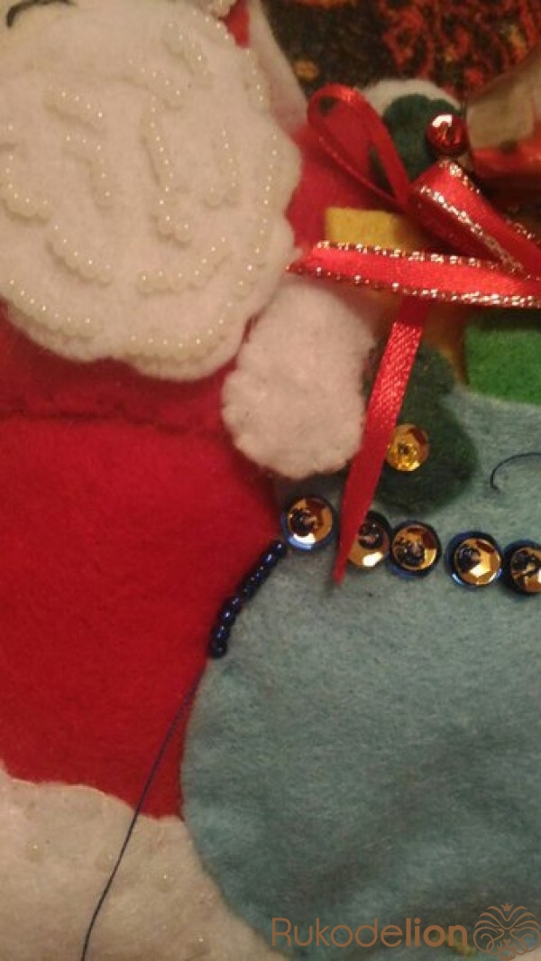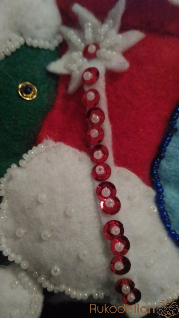 Займемся украшением работы: для этого пришиваем   бисер и пайетки  к  белому верху сапожка. К елочке пришиваем  разноцветный бисер и пайетки.